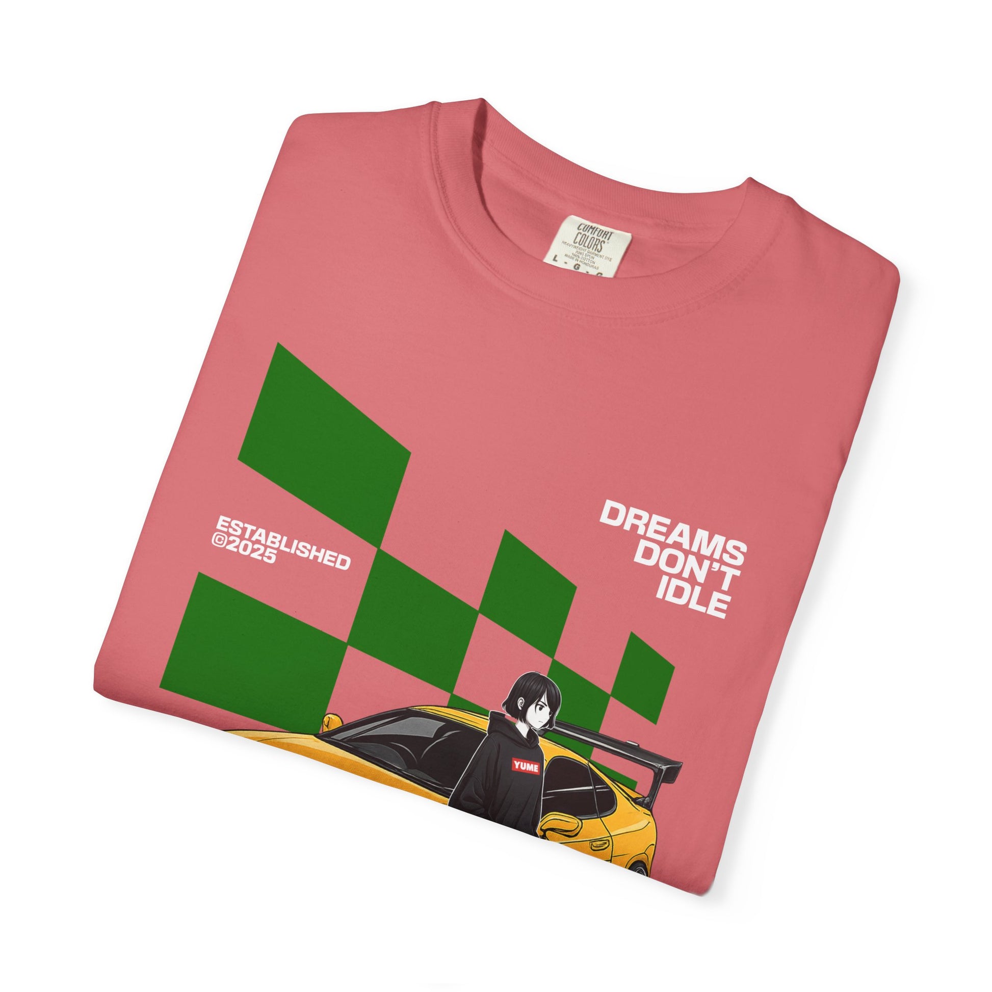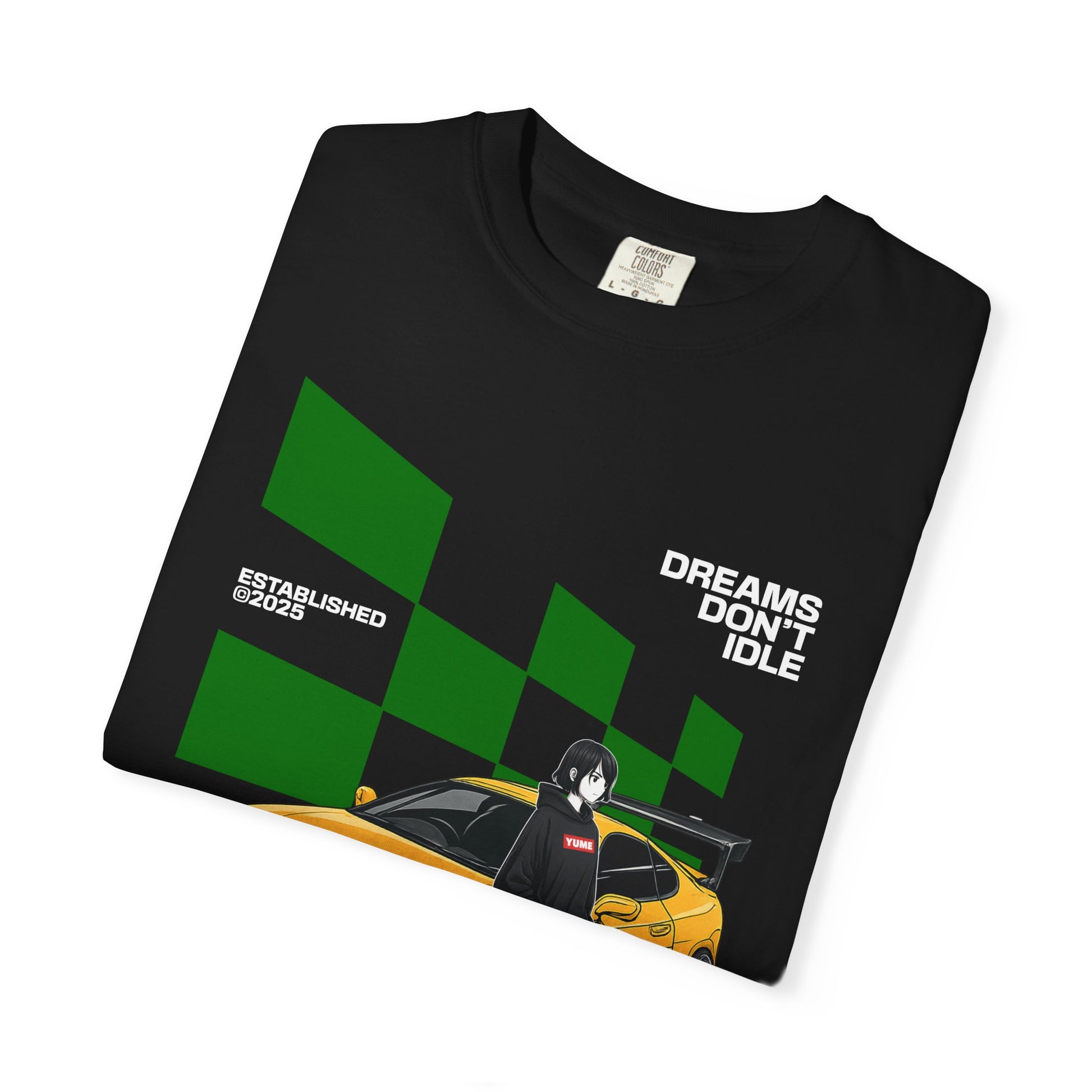 A heavyweight, garment-dyed tee inspired by late-night drives and street racing culture. Featuring a yellow sports car illustration, checkered race blocks, and a lone driver leaning on the hood. The vintage dye finish gives it a worn-in feel, while the relaxed fit and durable cotton keep it comfortable for everyday wear—from car meets to midnight runs.