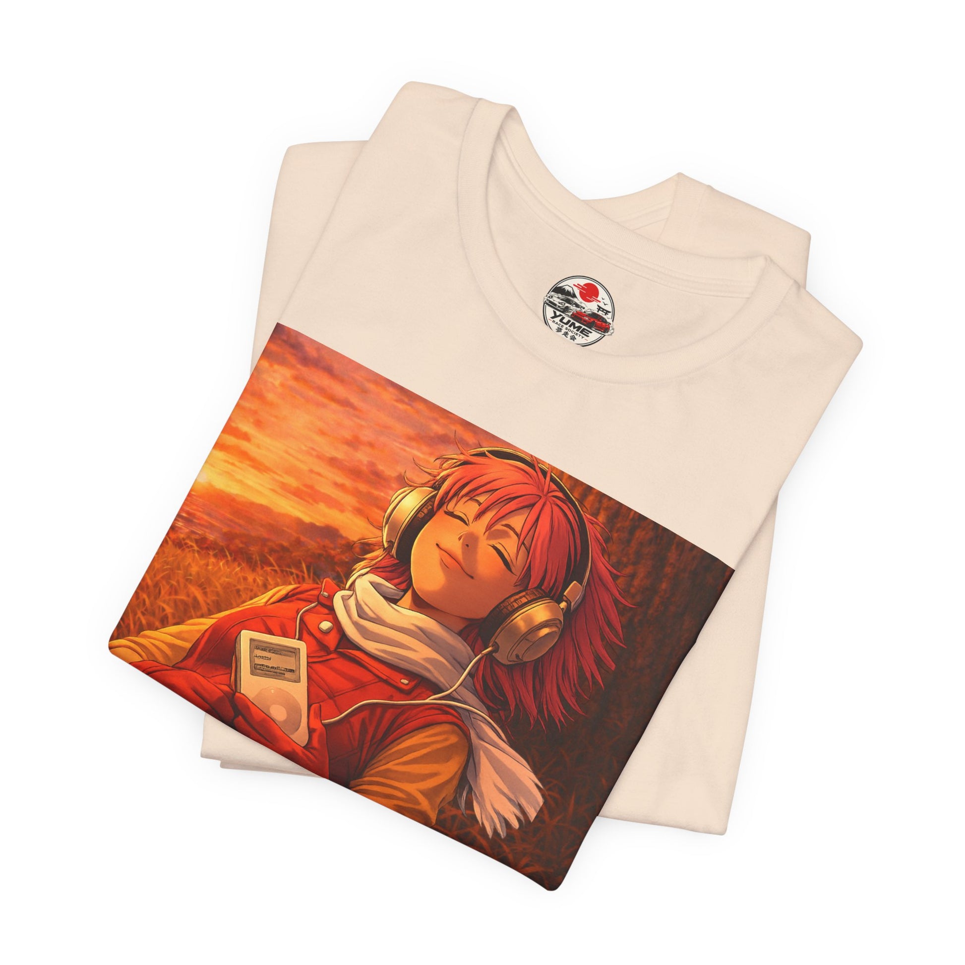 This lightweight jersey tee brings a quiet, sunset-hour mood to everyday wear. The front print shows a calm scene of a person listening to music at dusk — warm oranges and soft shadows that feel like the last golden minutes of the day. The crew neck and retail fit keep the silhouette familiar and easy to layer under a jacket or over a long-sleeve. Breathable Airlume combed cotton keeps the fabric soft against skin, while side seams and shoulder tape help the shirt hold its shape after repeated wear. Wear it when you want to slow down, press pause, and carry a small, personal moment with you.