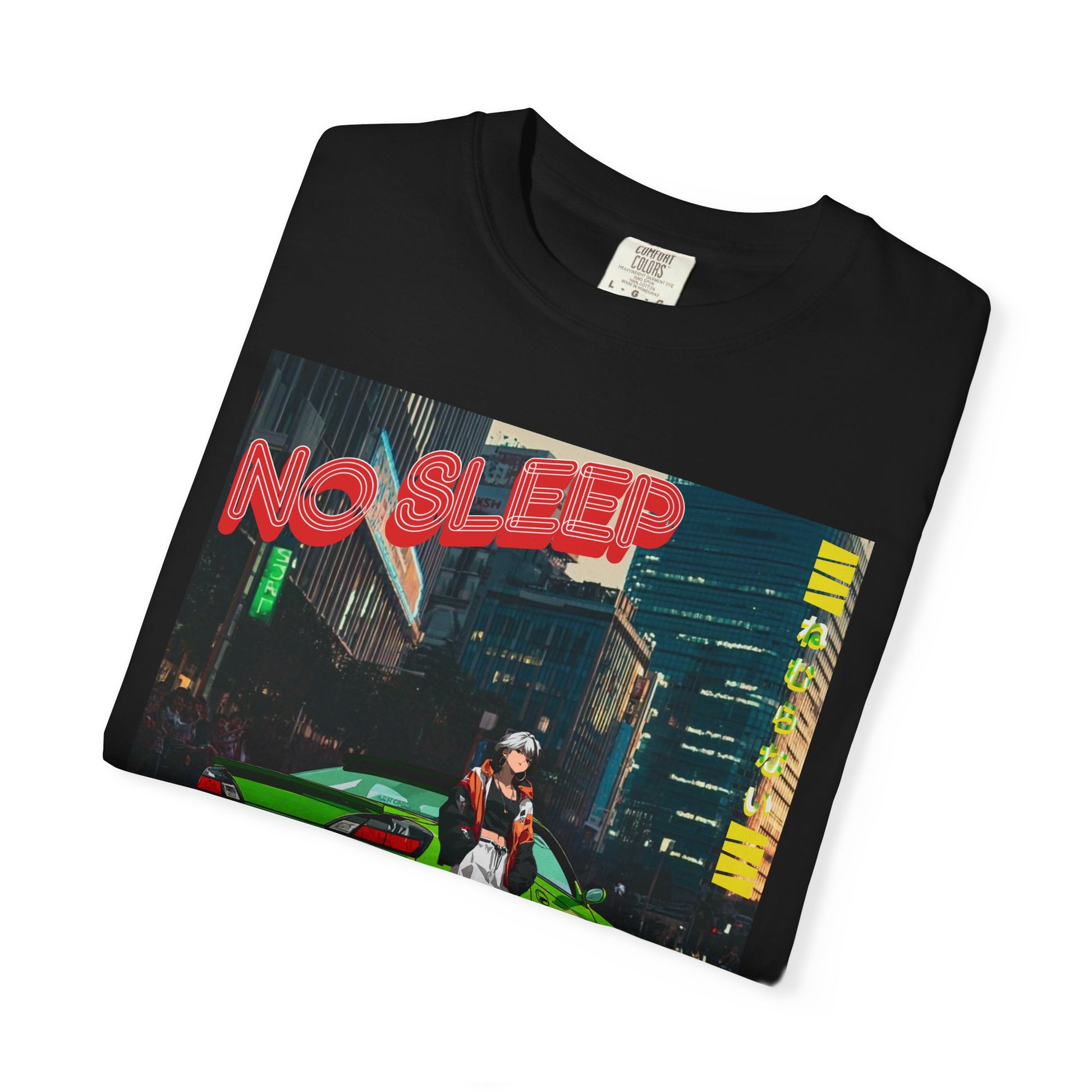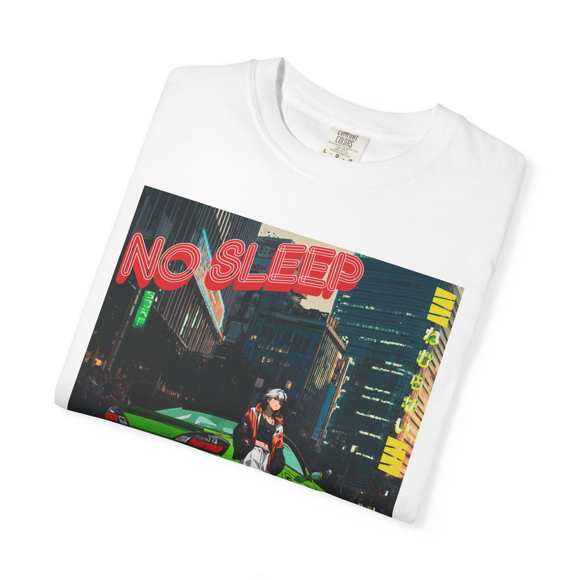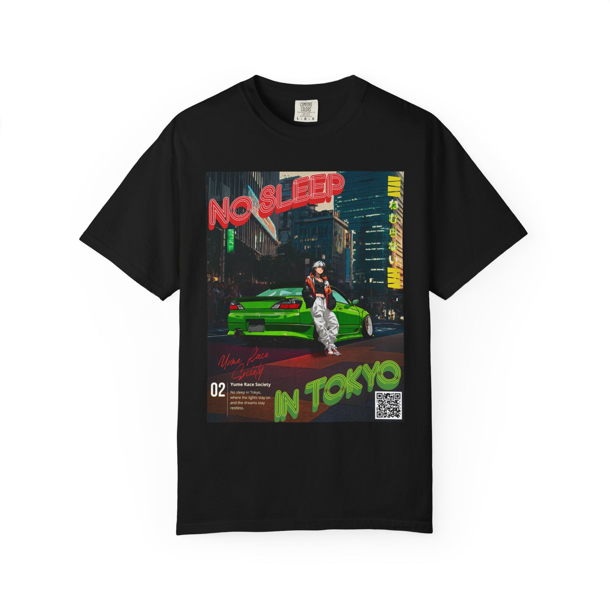 This garment-dyed T-shirt brings late-night neon streets and restless energy to your everyday wear. The front art—vivid green sports car, rain-slick asphalt, and bold red type—evokes sleepless nights cruising Tokyo avenues. The heavyweight, ring-spun cotton loosens into a lived-in softness after a few wears, while the relaxed cut and pre-shrunk fabric make it feel like something you’ve owned for years. Wear it to shows, night drives, or when you want to carry a bit of urban dusk with you. Subtle garment-dye texture and a sewn-in label keep the look authentic and vintage-inspired without shouting for attention.